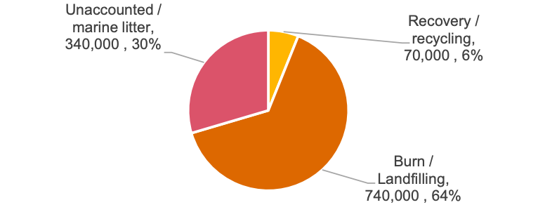 Plastic pollution is a critical issue in Nigeria due to inadequate waste management infrastructure. Lagos alone produces 8,400 metric tons of waste daily, with over 11% being plastics. The country's per capita plastic consumption has risen by 5.9% annually from 2007 to 2018, driven by increased plastic imports and domestic production. Nigeria imports 63% of its plastic resin, with only 28% produced locally. The plastic packaging sector, which has grown by 40% in the last five years, contributes significantly to the 1.15 million tons of plastic waste generated annually. Currently, only a small fraction of PET waste is properly managed, with the majority ending up in landfills, being incinerated, or contributing to marine litter.