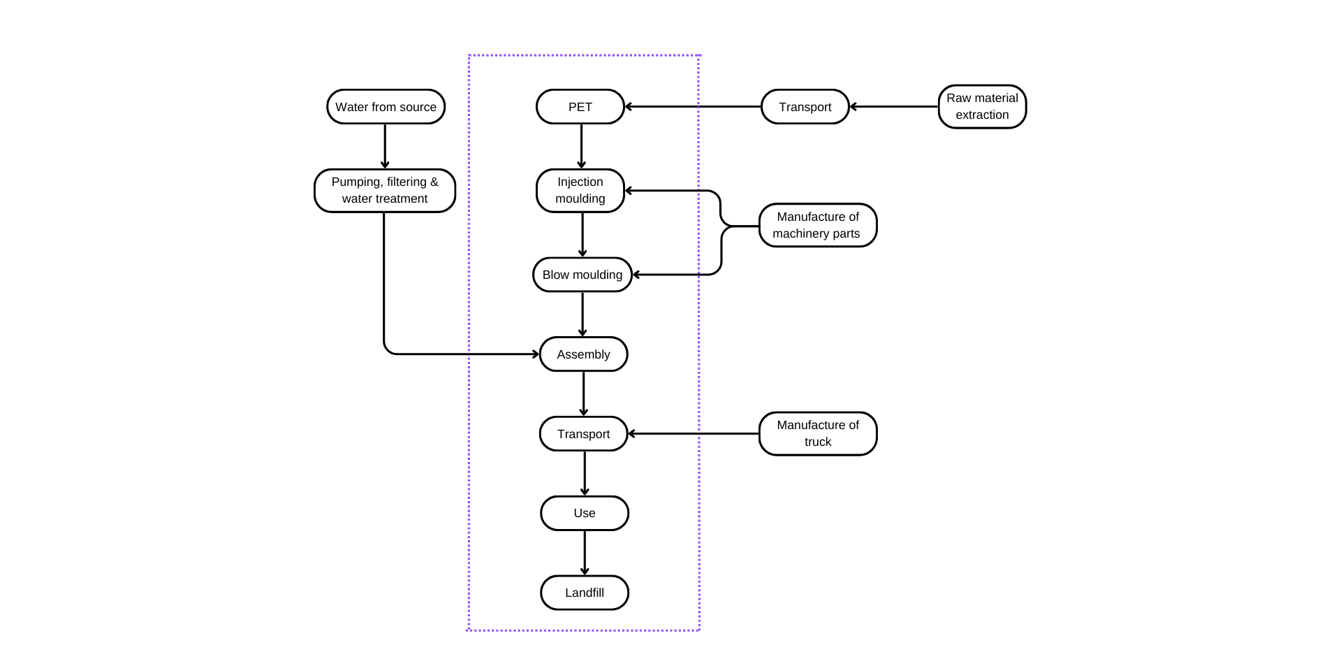 The product under analysis is a typical PET single-use plastic bottle, commonly used for packaging drinking water. PET is a type of plastic known for its strong, lightweight, and recyclable properties. The standard life cycle of a PET bottle includes raw material extraction, manufacturing, transportation, consumer use, and end-of-life disposal.