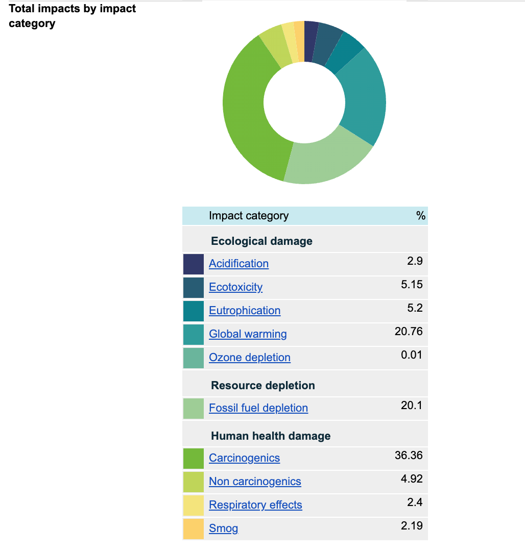 - Impact Categories: The top impact categories were Carcinogenics (36.36%), Global warming (20.76%), and Fossil fuel depletion (20.1%).