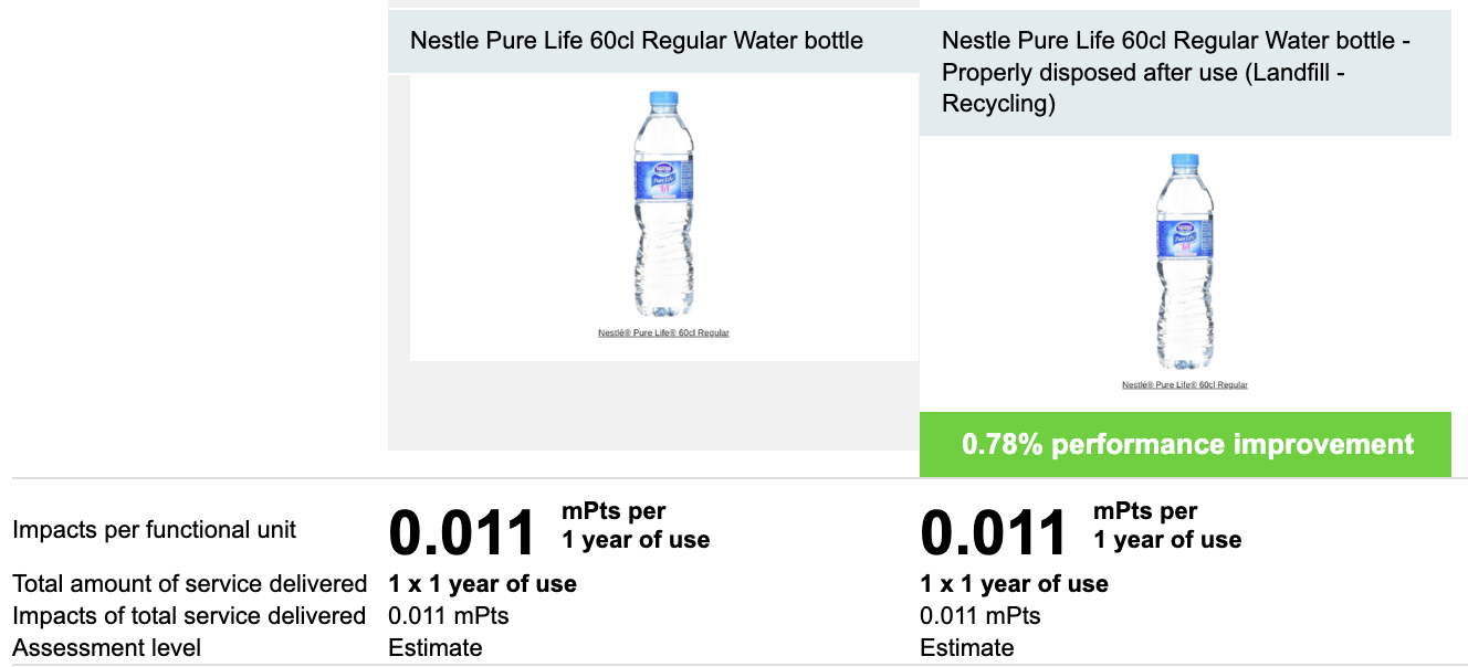 A shift in consumer behavior and disposal methods for PET bottles from landfills to recycling can have a positive environmental impact. The LCA results below demonstrate a 0.78% performance improvement.